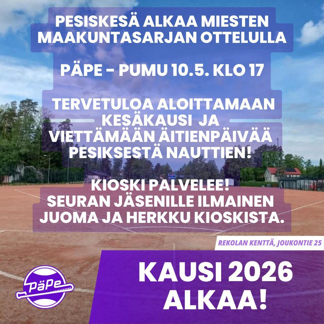 Rekolan liikuntapuiston pesiskesän 2026 avaa miesten maakuntasarjan ottelu, jossa Päiväkummun Pesis saa vastaansa Helsingin PunaMustat. Ottelu pelataan Rekolan pesäpallokentällä äitienpäivänä sunnuntaina 10.5. klo 17. Ottelutapahtumassa palvelee kioski kuumin ja kylmin herkuin. PäPe toivottaa kaikki lämpimästi tervetulleeksi nauttimaan pesäpallosta ja pesiskesän alkamisesta Rekolaan sekä viettämään äitienpäivää mukavasti pesiksen merkeissä! Tervetuloa!